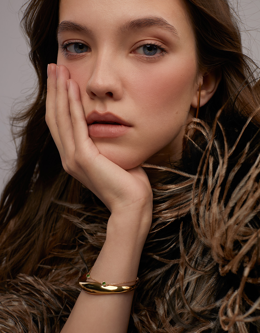 Delikatna bransoletka Catch z trzema Chromodiopsydami wykonana z 14K żółte złoto (próba złota 585).